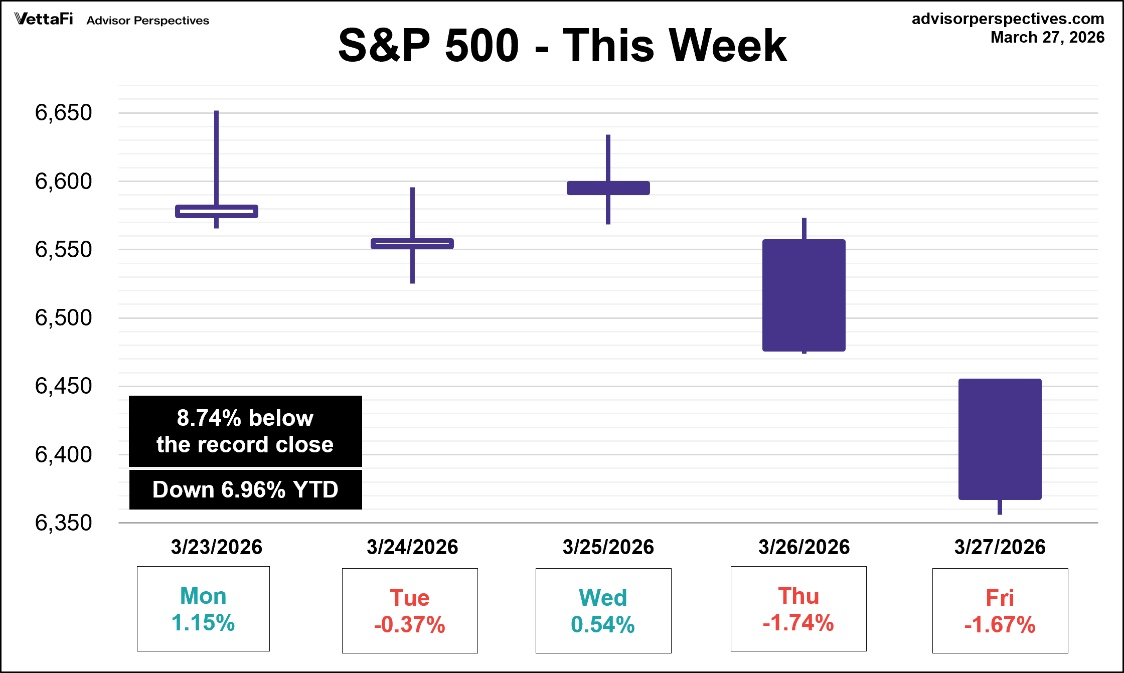 The S&P 500 finished the week at its lowest level in over seven months and is now inches away from correction territory, sitting 8.74% off its all-time high from January 27, 2026. The index posted its fifth consecutive weekly loss, its longest streak since 2022, falling 2.1% from last Friday. Here is a snapshot of the index from the past week: