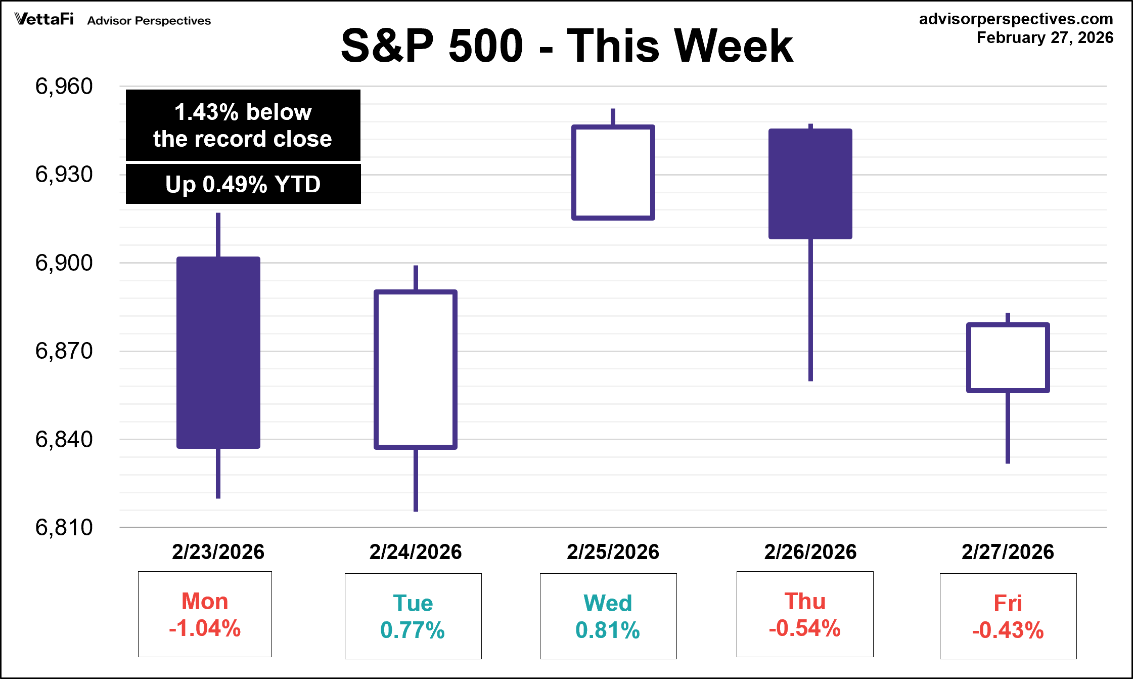 The S&P 500 slipped back below its 50-day moving average to end the week, marking the index's seventh cross of the key trendline this February. The index finished the week with a loss of -0.4% and is now 1.43% off its all-time high from January 27, 2026. Here is a snapshot of the index from the past week: