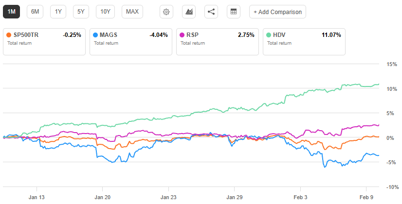 Mega-cap growth stocks have come under pressure in 2026 as the Magnificent 7 leadership that dominated the past few years shows signs of fatigue. Earnings from several flagship technology names have been mostly solid, yet price action suggests investors are demanding greater selectivity rather than paying any price for size and brand. At the same time, a select group of smaller AI-leveraged growth companies and the value segment overall have quietly outperformed, highlighting an accelerating market rotation beneath the surface of the S&P 500. For a simplified perspective, you can look at key benchmark performance over the past month, where the Magnificent 7 ( MAGS ) has fallen behind an equal-weighted index ( RSP ) and high dividend yield stocks ( HDV ):