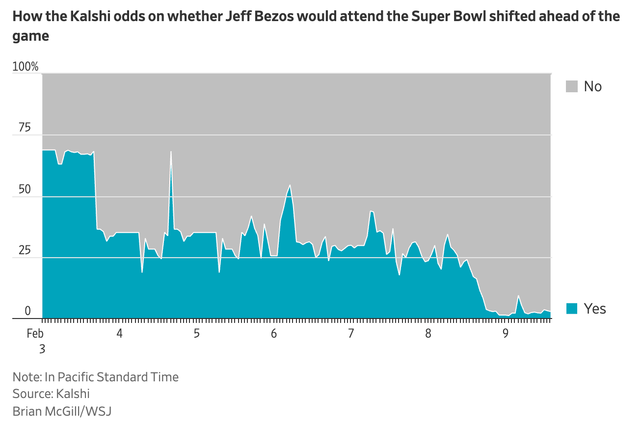 That’s basically the description of a world where we can literally bet on anything, whenever we want. I’m talking about prediction markets, which were just covered by The Wall Street Journal . It brought up how even fraternity brothers are going wild on the most ridiculous bets, including betting thousands of dollars on whether Jeff Bezos would attend the Super Bowl: